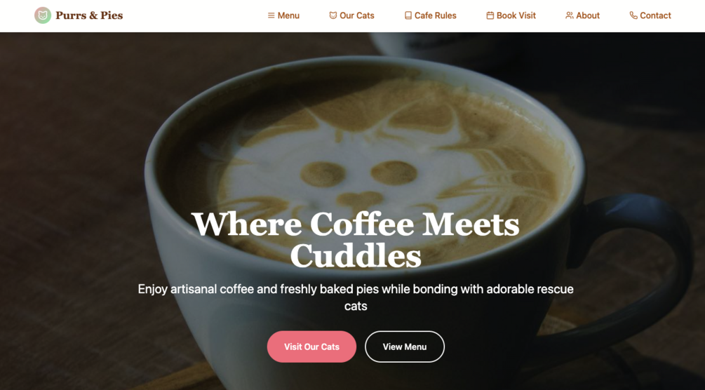 I dream of opening a cozy cat café where rescue cats, warm pies, and kind people come together. While I work toward that dream, I’ve created this charming website template to share the concept — and help others do the same!